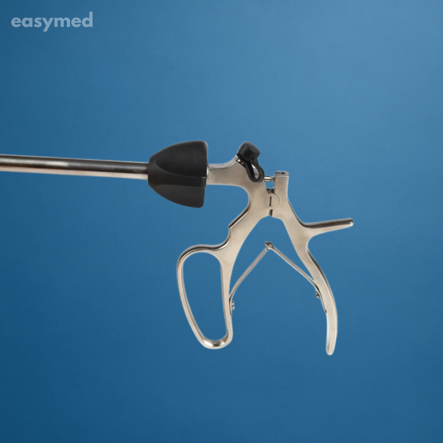 Aplicador de grapas de titanio LT100 para cierre de vasos de calibre pequeño en laparoscopía. Fabricado en acero inoxidable 304 de grado médico con vástago aislado PEEK; reusable y esterilizable en autoclave. Certificado CE.