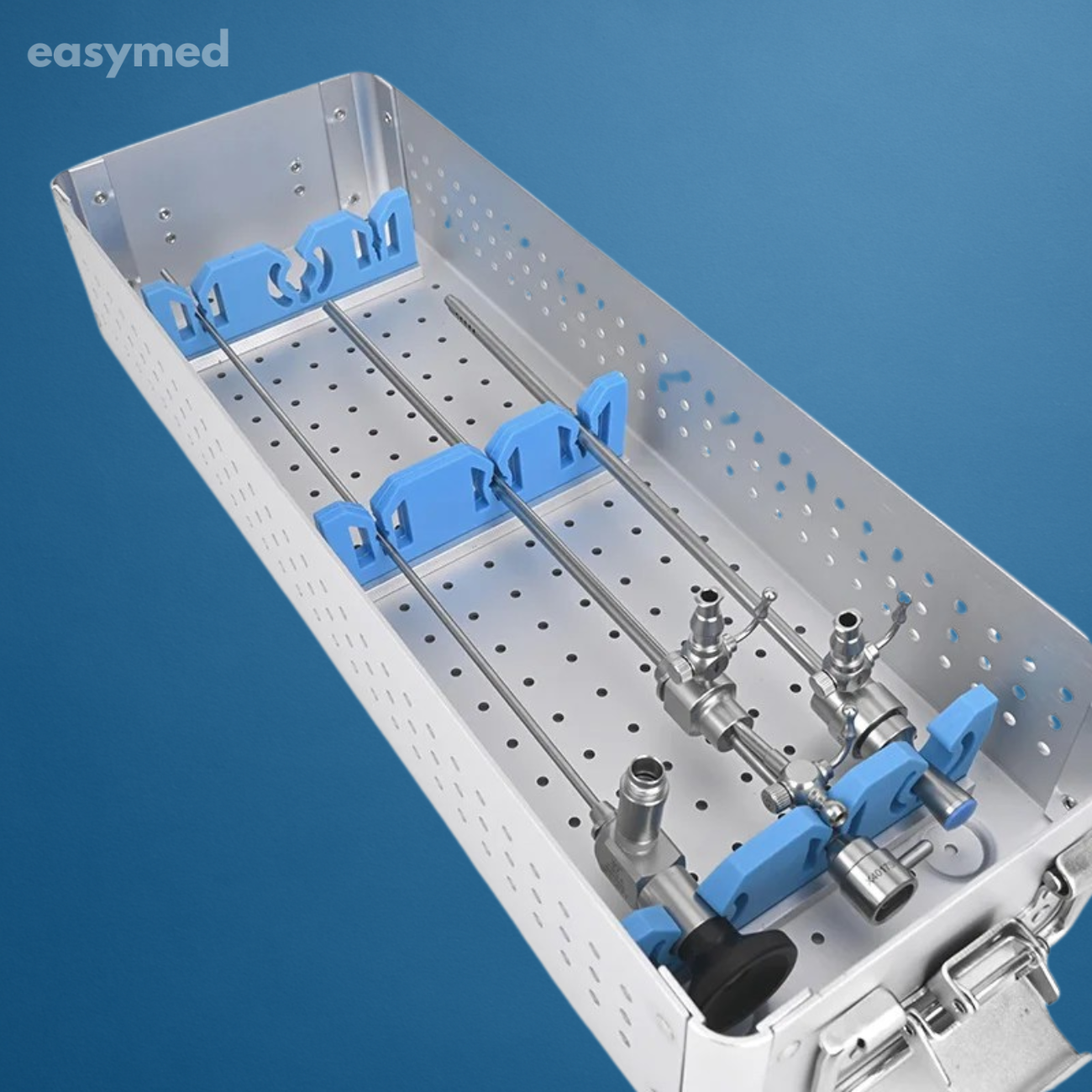 Charola compacta de acero inoxidable 304 diseñada específicamente para histeroscopios y accesorios ginecológicos. Con medidas de 400 × 140 × 70 mm, ofrece organización segura y óptima circulación de vapor en autoclave.
