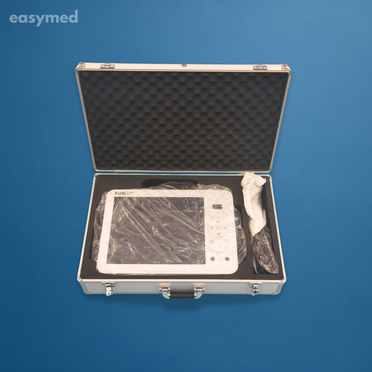 Sistema portátil de video para endoscopia con monitor médico de 17″ Full HD, cámara de endoscopia CMOS 1/1.8″ y fuente de luz LED integrada. Incluye unidad completa para grabación HD y cables de alta resistencia, ideal para procedimientos mínimamente invasivos. Reutilizable y certificado bajo estándares internacionales.