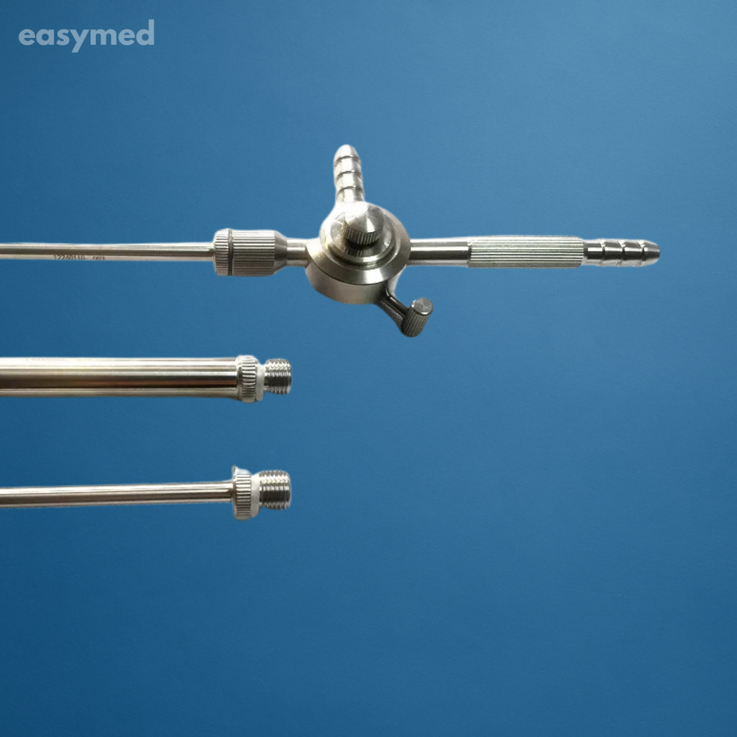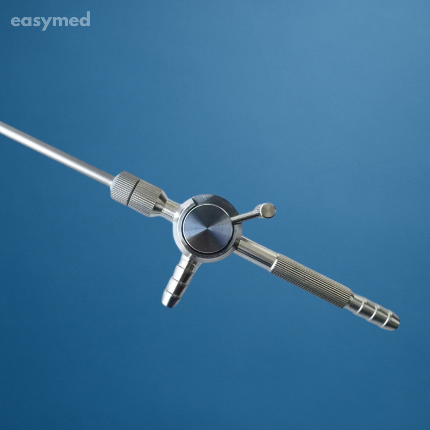 Kit reusable de succión e irrigación para laparoscopía, equipado con gatillo de palanca de acero inoxidable que permite alternar rápida y cómodamente entre aspiración e irrigación. Compatible con tubuladuras estándar, esterilizable en autoclave y certificado CE e ISO.
